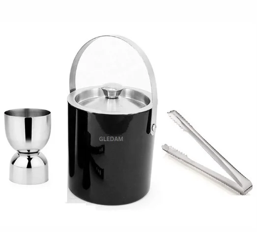 GLEDAM 1 Litre Double Walled Anti Rust Stainless Steel Insulated Black Ice Bucket with Silver Lid,Ice Tong & Japanese Jigger | Keeps Ice Cold for 8 h | Home and Party Bar .Set of 3 Pcs.1Litre.